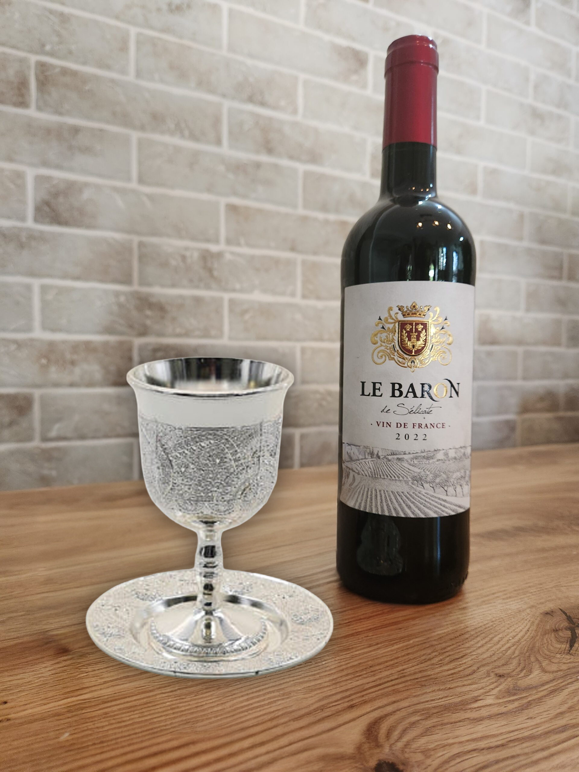 סט יוקרתי בקבוק יין צרפתי יקב בוטיק כשר מהדרין  גביע קידוש מוכסף כולל תחתית מהודר מבצע